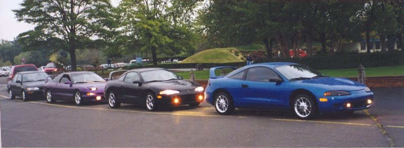 | . I drive the 94 Purple Probe GT w/a Super spoiler. Shown is Racheal's Black Eclipse and Chris's Blue Eclipse. Other cars in my group is Sang's Red 97 Eclipse Spyder GS-T, Te's Black MX-3, William's White MX-3, Nam's Teal Green 95 Civic EX-Turbo-charged w/a Greedy Kit. All cars listed is modified and sports a super-spoiler. | My car is lowered 1.75" using INTRAX springs, Greddy 130mm cat-back exhaust, K&N filter cone, and sports 17x7.5 Enkei G-Zeros with 225/45ZR17. My interior is